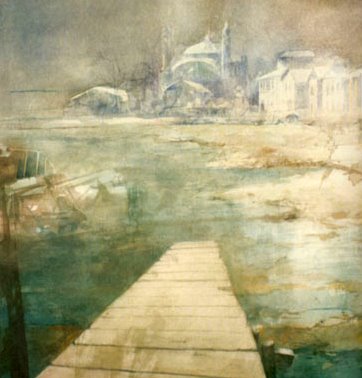 Calvino raramente descrive: piuttosto evoca. La sua non è una prosa “colorata”, termine di cui si è tante volte abusato in riferimento a vari scrittori. Le città invisibili sono piuttosto un « inimitabile libro di figure senza illustrazioni » [Flavia Ravazzoli, Il testo perpetuo. Studi sui movimenti retorici del linguaggio, Milano, Bompiani, 1991, p. 147.]. È superfluo insistere in questa sede sull’interesse, anche attivo, nutrito dallo scrittore, sin dalla prima giovinezza, per l’espressione figurativa, argomento cui sono stati dedicati diversi brillanti interventi contenuti in questo stesso volume. Eppure ne Le città invisibili i cromonimi scarseggiano e i rari termini di colore sono usati in modo piuttosto convenzionale. Le “descrizioni” consistono principalmente in accumuli paratattici, scanditi da allitterazioni, queste ultime impossibili da rendere con mezzi iconici. I delicati cromatismi degli acquerelli di Cano e la loro economia figurativa sono dunque frutto esclusivo dell’immaginazione del pittore. Niente a che vedere tuttavia con le ricostruzioni utrilliane dei colori reali delle vedute raffigurate dalle cartoline in bianco e nero. Il colore, che sfiora spesso il monocromatismo, viene trasfigurato in un gioco di tonalità e funziona autonomamente, come visualizzazione di quello che per l’artista è il clima che domina il racconto. « Un’avventura straordinaria e intensissima che dà visibilità alle invisibilità di Calvino » [Sebastiano Grasso, Zora? È come una partitura musicale. Viaggio di Pedro Cano nelle metropoli immaginarie di Italo Calvino, « Corriere della sera », 1 novembre 2004, p. 25.], scrisse Sebastiano Grasso a proposito dell’edizione romana della mostra. Cano però non illustra Calvino : per lo più prende lo spunto da frasi o parole isolate del testo, per sviluppare, a partire da esse, un’immagine parallela. Con la metonimia intersemiotica rinuncia anch’egli a descrivere.
