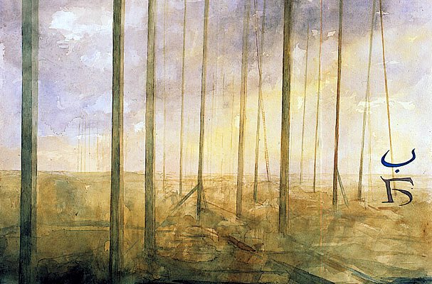 La malinconica figura del vecchio capraio smarrito, alla pari dello stesso narratore, in una città continua è certamente quella che domina il racconto ; quello che colpisce però nel ritratto che ne dà Cano è la somiglianza con Jorge Luis Borges, maestro del doppio, la cui cecità non è più quella fisica, ma consiste nell’incapacità di distinguere i luoghi urbani. Da notare che nel bozzetto iniziale il volto del protagonista è ben diverso: più rozzo e meno sofferente, e soprattutto con gli occhi curiosi e ben aperti. Nel catalogo il pittore non accenna minimamente al percorso che lo ha portato a questa significativa trasformazione, scaturita in realtà da una esperienza personale [Ibidem]. Alla destra di ogni immagine, due lettere (che corrispondono alla iniziale di ogni nome-città-donna) poste proprio sul luogo dove poggia la mano di chi apre il libro ed estratte da alfabeti per la maggior parte antichi, servono, come scrisse lo stesso Cano, « a testimoniare come due segni assolutamente diversi possano dare lo stesso suono » [Pedro Cano, Le città invisibili, cit., s.n] e questa mi sembra l’essenza stessa della sua operazione.